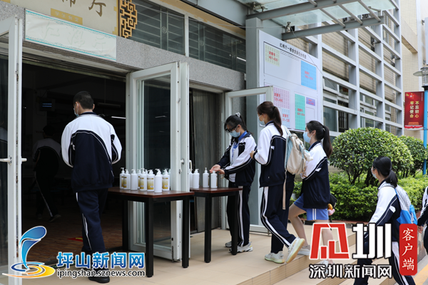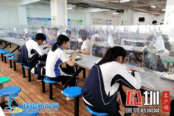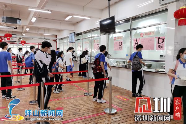 在坪山高级中学食堂入口旁边,记者看到一排新安装的自动感应水龙头,方便学生洗手,学生在进食堂前还可以用免洗洗手液洗手。食堂内,排队间距标识、用餐隔板、分区就座标识清晰可见。
