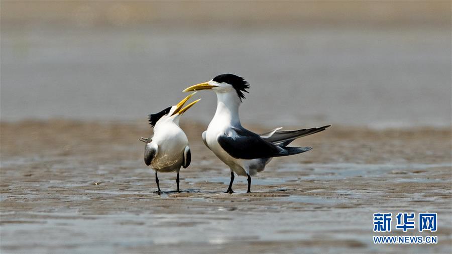 眼下正是大凤头燕鸥繁育的时节,在福建闽江河口湿地核心区鳝鱼滩的沙洲上,大凤头燕鸥正相互嬉戏(5月9日摄)。新华社记者梅永存摄