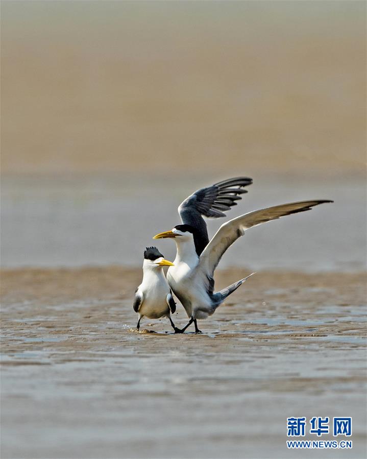 眼下正是大凤头燕鸥繁育的时节,在福建闽江河口湿地核心区鳝鱼滩的沙洲上,大凤头燕鸥正相互嬉戏(5月9日摄)。新华社记者梅永存摄