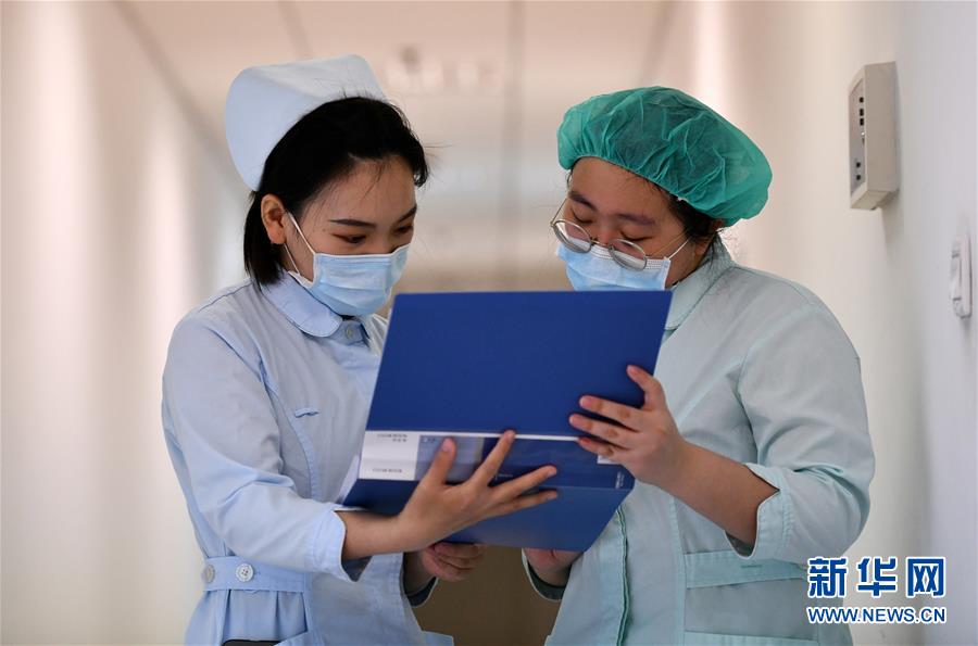 5月11日,张硕(左)在“绿区”和值班护士互相交流。5月11日,天津首批援鄂医疗队队员张硕经过一段时间的休整后,正式回到天津医科大学总医院空港医院开始上班,主要在医院隔离病房“绿区”负责准备防护物资、协调处理“红区”护士需求等工作。新冠肺炎疫情发生后,“90后”张硕第一时间报名参加援鄂医疗队,并在武钢二院担任“红区”护士。在52天的战“疫”生涯中,张硕光荣入党。新华社记者 李然 摄