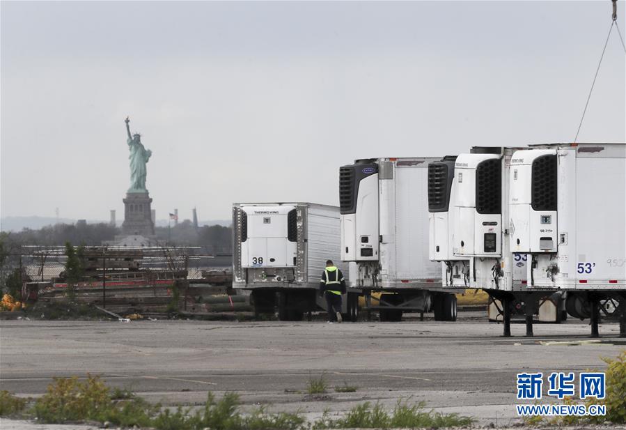 5月11日,冷藏车停放在美国纽约布鲁克林一处新开辟的临时停尸场所内。美国约翰斯·霍普金斯大学11日发布的新冠疫情最新统计数据显示,美国累计死亡病例超过8万例。新华社记者 王迎 摄