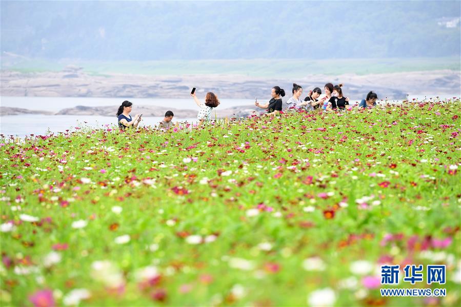 5月20日,在重庆市巴南区木洞镇长江岸边,游客在格桑花海中拍照留念。近日,重庆市巴南区木洞镇长江岸边的格桑花竞相开放,吸引游客前来赏花观景。新华社记者唐奕摄