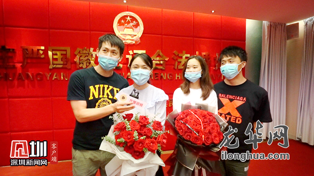 见圳客户端·深圳新闻网5月20日讯(记者 胡安坤)“2020年5月20日,象征着爱你爱你我爱你,这个日子很难得,我们就决定这一天来领证。”刚刚领完证的黄先生喜上眉梢。2020年5月20日谐音为“爱你爱你我爱你”,不少准新人都希望能在这个浪漫的日子里办理结婚登记。记者从龙华区婚姻登记处了解到,“5·20”当天,龙华区共有108对新人登记结婚。