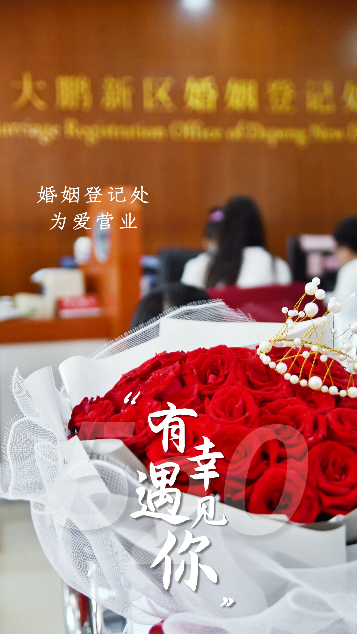 据大鹏新区婚姻登记处相关负责人介绍,以往,需要预约办理婚姻登记的当事人,需要至少提前两个工作日登录“广东省民政婚姻网上预约系统”进行预约,今年大鹏新区婚姻登记处特别设置了现场预约,尽可能的让新人们在这个特殊的日子收获自己幸福美满的婚姻。截止记者发稿,“520”当天共有41对新人通过网上预约以及现场预约的形式,在大鹏新区婚姻登记处办理了登记手续。