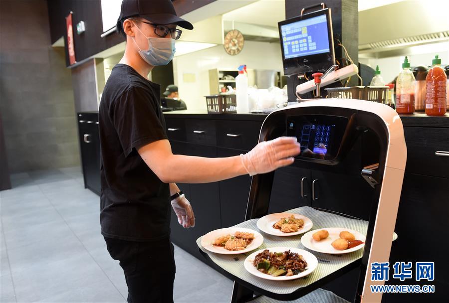 5月28日,在奥地利维也纳一家亚洲餐厅内,服务员为机器人设置送餐桌号。维也纳的一家亚洲餐厅于疫情期间重新营业后,更多利用机器人上菜,以减少服务员和顾客之间的非必要接触。新华社记者郭晨摄