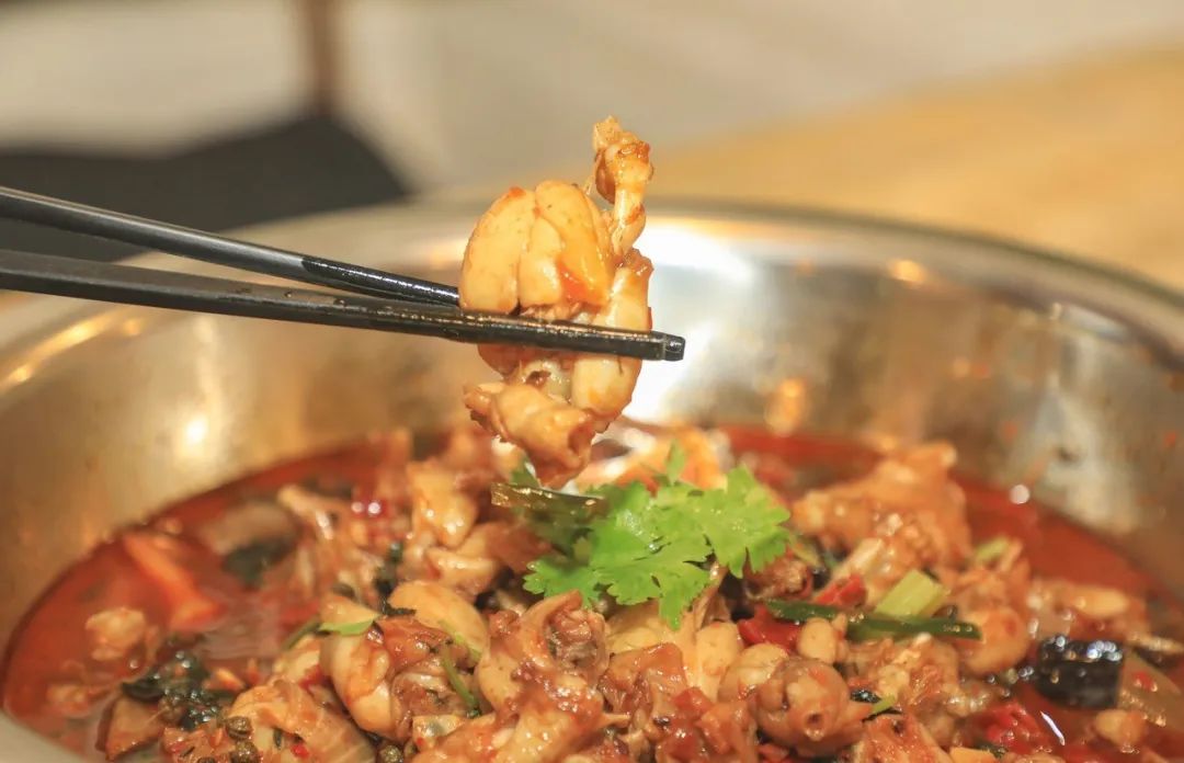 火辣辣的跳跳蛙、紧实的蛙腿肉被红油所包裹,泡椒和紫苏的加入让这道咸鲜的菜肴多了一丝风味,口腔里火热的触感告诉我们,真的爽!