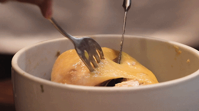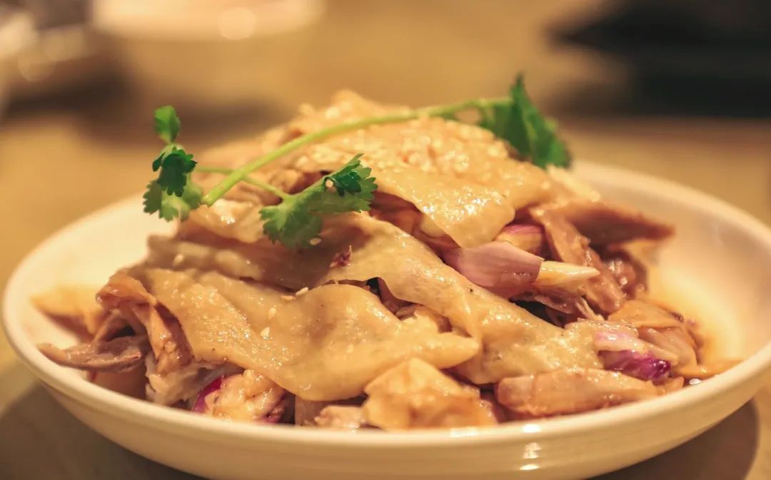爽滑又有嚼劲的鸡皮之下,是手撕好的鲜嫩鸡肉,微微辛辣的洋葱配以醇香的酱油,这道手撕葱油鸡令人食指大动!