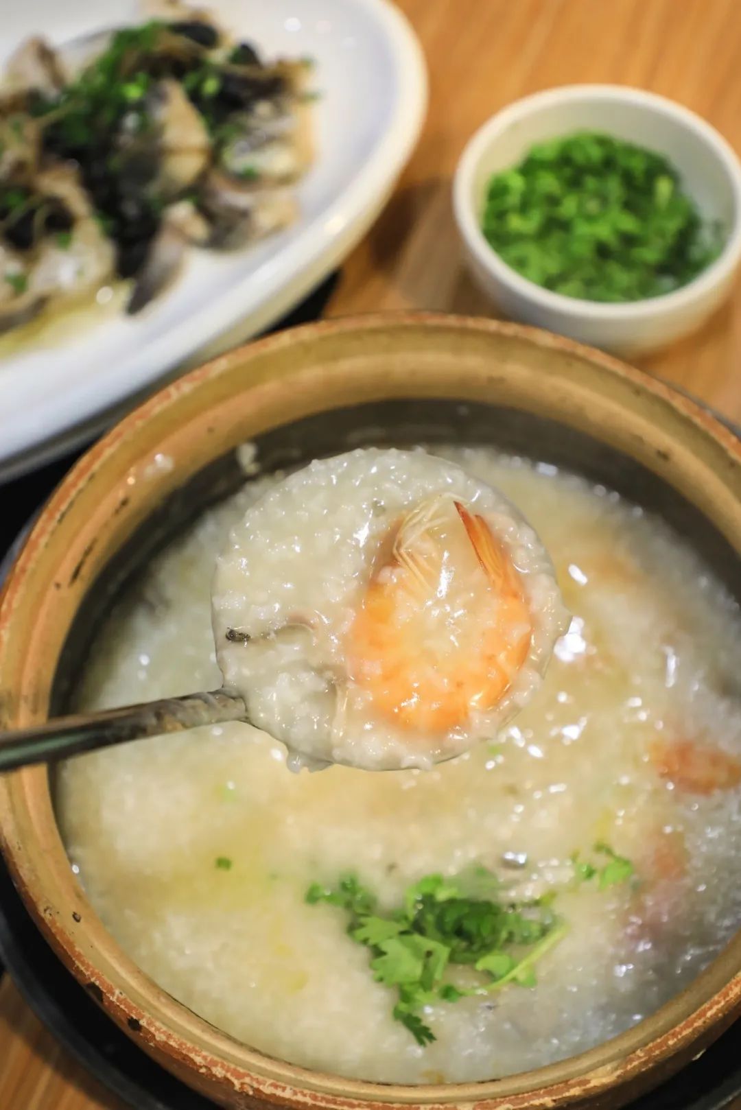 这道大虾侧鱼粥是店内的招牌菜品,大米煮至软糯晶莹,加入个头大小适中的新鲜活虾和侧鱼片,熬出绵稠的质感出锅后,撒上香葱香菜,一勺热乎的粥入口回味无穷。
