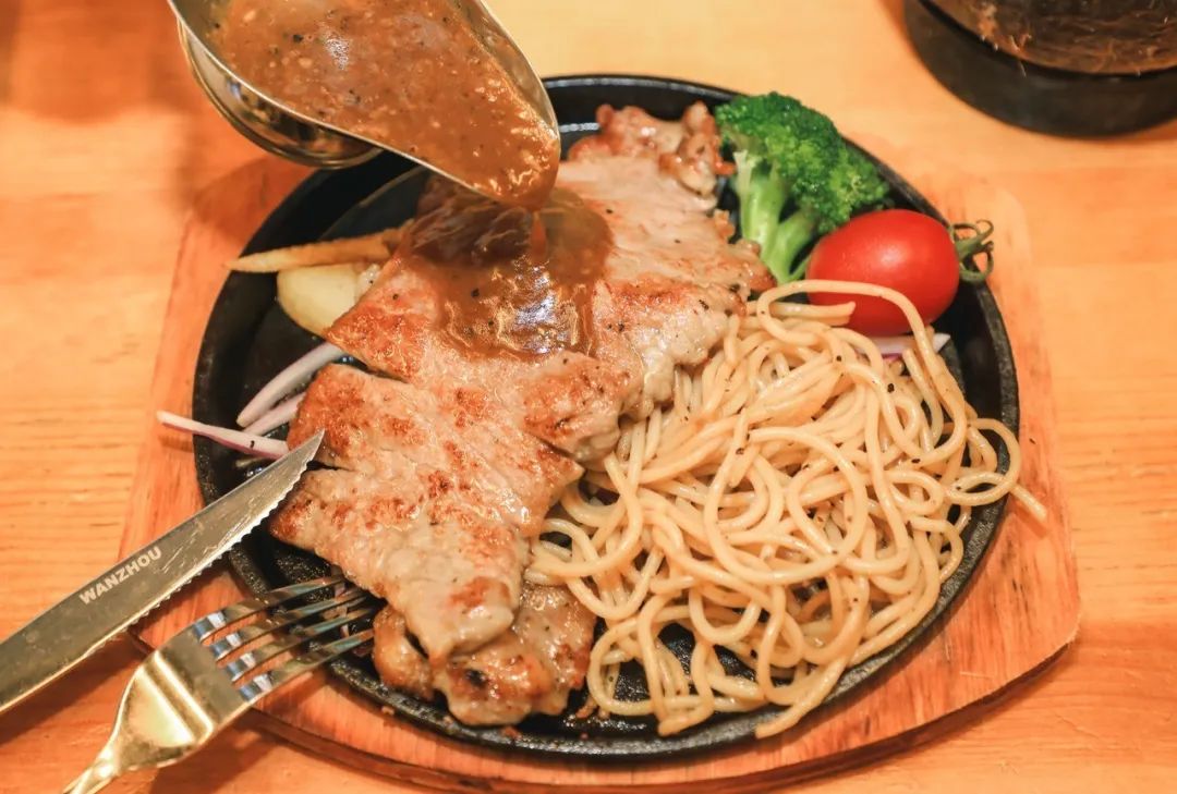 点一份店里铁板厚切西冷牛排套餐,上桌后牛排仍在滋滋作响、肉香四溢。