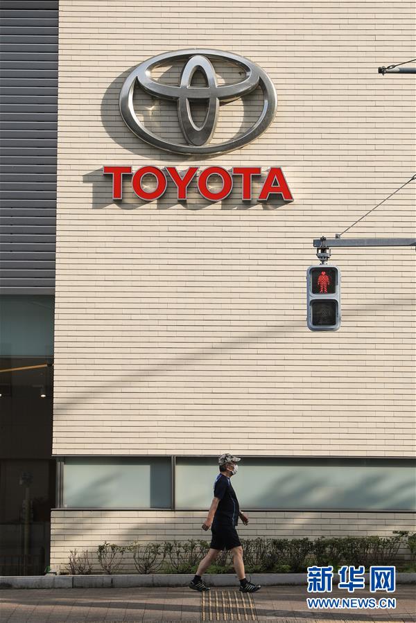 6月29日,行人从日本东京一处丰田汽车公司标志下走过。日本丰田汽车公司29日公布的数据显示,受新冠疫情蔓延影响,5月丰田在全球的汽车产量同比下降54.4%,为2004年有可比数据以来最大降幅。新华社记者杜潇逸摄