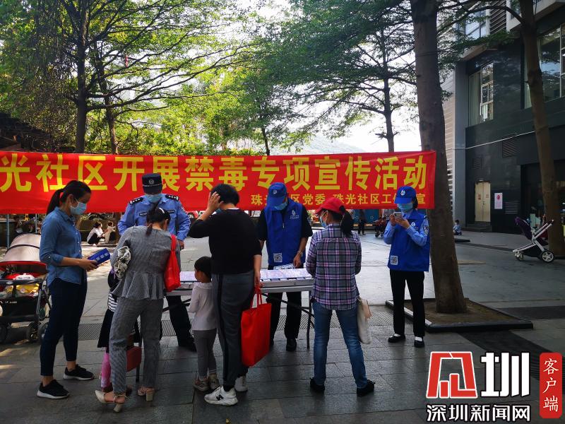 见圳客户端、深圳新闻网讯(记者 王志明 通讯员 谭舒晖)为进一步加强居民抵制毒品和毒品危害意识的能力,普及禁毒知识,增强居民“防毒”、“识毒”和“拒毒”的意识。2020年6月29日下午,桃源街道珠光社区工作站联合珠光警务室在花半里广场开展禁毒宣传活动。