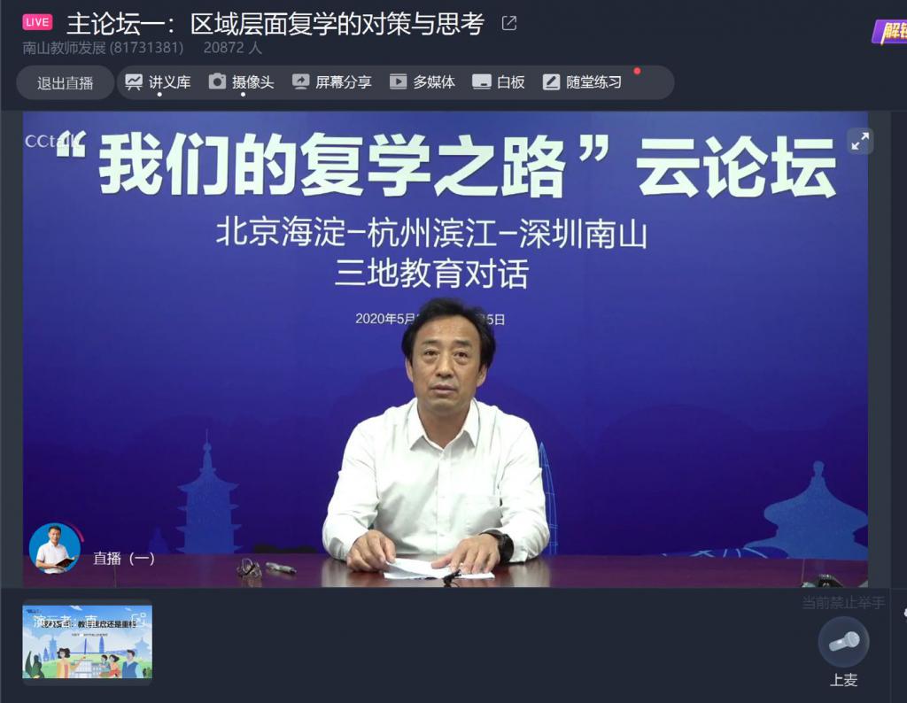余耀贤介绍,疫情防控期间,南山区化"危"为"机",一手抓疫情防控,一手抓在线教学,率先开设"空中课堂""名师天天在线",上线"南山教育在线小程序",共有6819名教师参加在线教学,10.26万名学生参与在线学习,直播和录播课点播量达743万人次,实现优质教学资源全覆盖,在线教学效益最大化。
