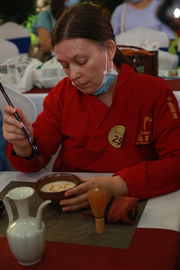 赛事开始前,点茶选手行拱手礼,由《茶道印象》剧组演绎的开场舞台剧《茶道印象》之《漏影春·长乐图》让现场的嘉宾评选、选手观众眼前一亮。靓丽的华服、精彩的剧情、精湛的点茶技法无一不吸引着人们的目光。本次大赛分两轮进行,第一轮,所有选手在台下比拼,10人一组,以统一的茶汤画面进行评比。评委们通过礼仪、仪容仪表、点茶速度、沫饽细腻度、茶汤画面清晰度、耐久度这六个方面进行评分,评分最高的十位选手将进入第二轮。第二轮,两人一组,并将赛场挪到舞台,让选手们可以更加专心致志地进行比拼。评委们通过礼仪仪容仪表、拿茶宪的姿势标准度、点茶的速度、沫饽细腻度、耐久度、加分项(是否得过奖)六个方面进行评分。