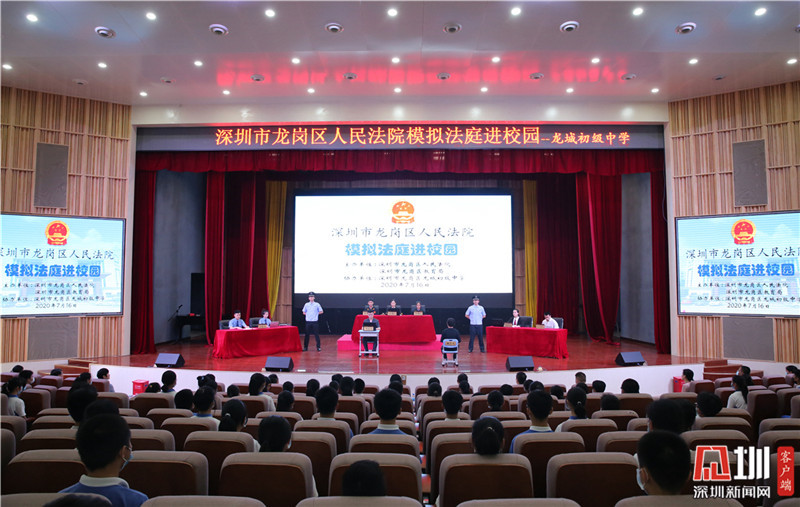 见圳客户端·深圳新闻网7月21日讯(见圳客户端、深圳新闻网记者 李云云 通讯员 张建国)近日,一场别开生面的“庭审”在龙岗区龙城初级中学展开。在报告厅现场,150名学生目不转睛、屏气凝神地观摩“审判”活动,在各班教室,还有1300多名学生观看线上直播。原来,这是龙岗法院青少年普法教育品牌“模拟法庭进校园”活动。据了解,此次“模拟法庭进校园”活动是龙岗法院今年首次举行,也是该普法活动自2017年启动以来的第32场。