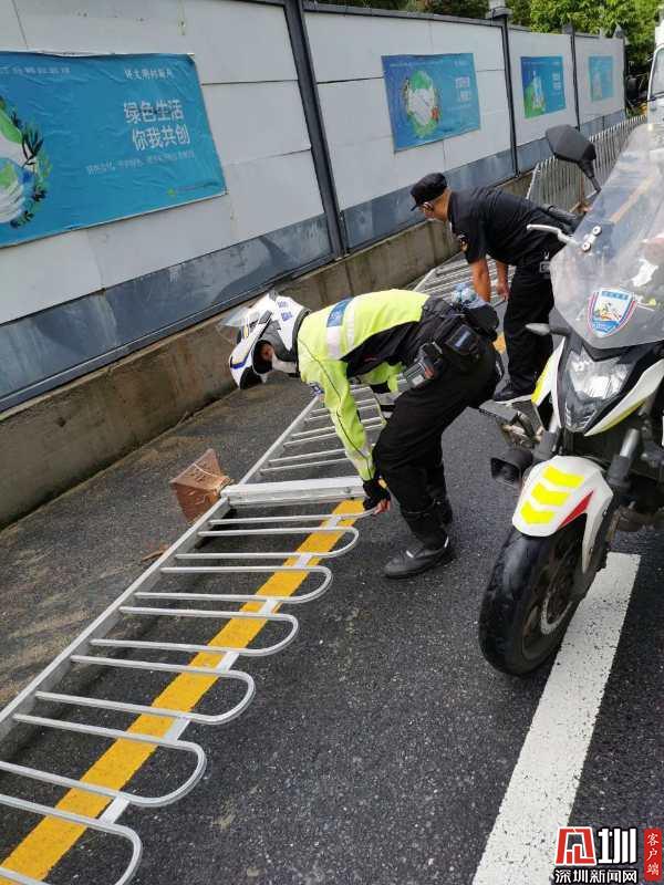 9月21日9时许,罗湖大队黄贝中队铁骑队员罗益华巡逻至仙湖路时,发现路边近5米长的护栏倒地,路过的车辆纷纷降低速度避让,严重影响过往车辆和行人的正常通行,安全隐患极大,罗益华立即与群众一同将护栏扶正、归位,交通隐患得到及时排除,道路也恢复畅通。