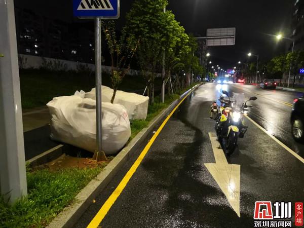 9月18日,罗湖大队笋岗中队警力马清田、杨宇翰巡逻至珠岭路时,发现一大袋泡沫被遗落在机动车道,马清田、杨宇翰立即上前将泡沫移至人行道上,保障该路段车辆安全、有序通行。