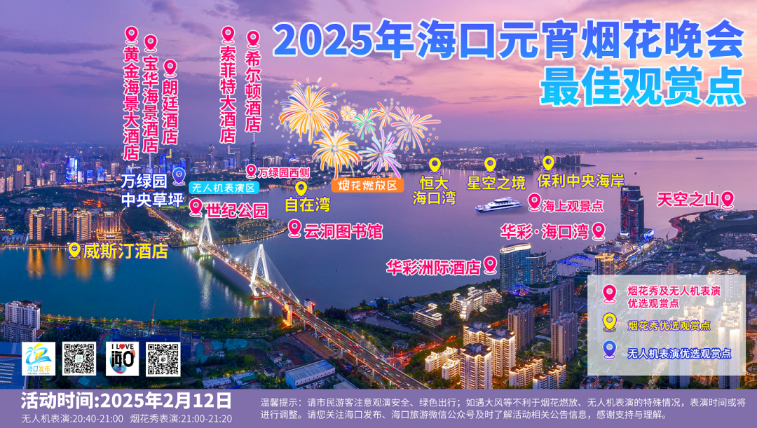 本次烟花晚会以“海口湾 看烟花”为主题,为I级烟花表演,将为市民和游客献上一场壮观的视觉盛宴。晚会的表演时间定于2月12日晚20:40至21:20,持续40分钟。