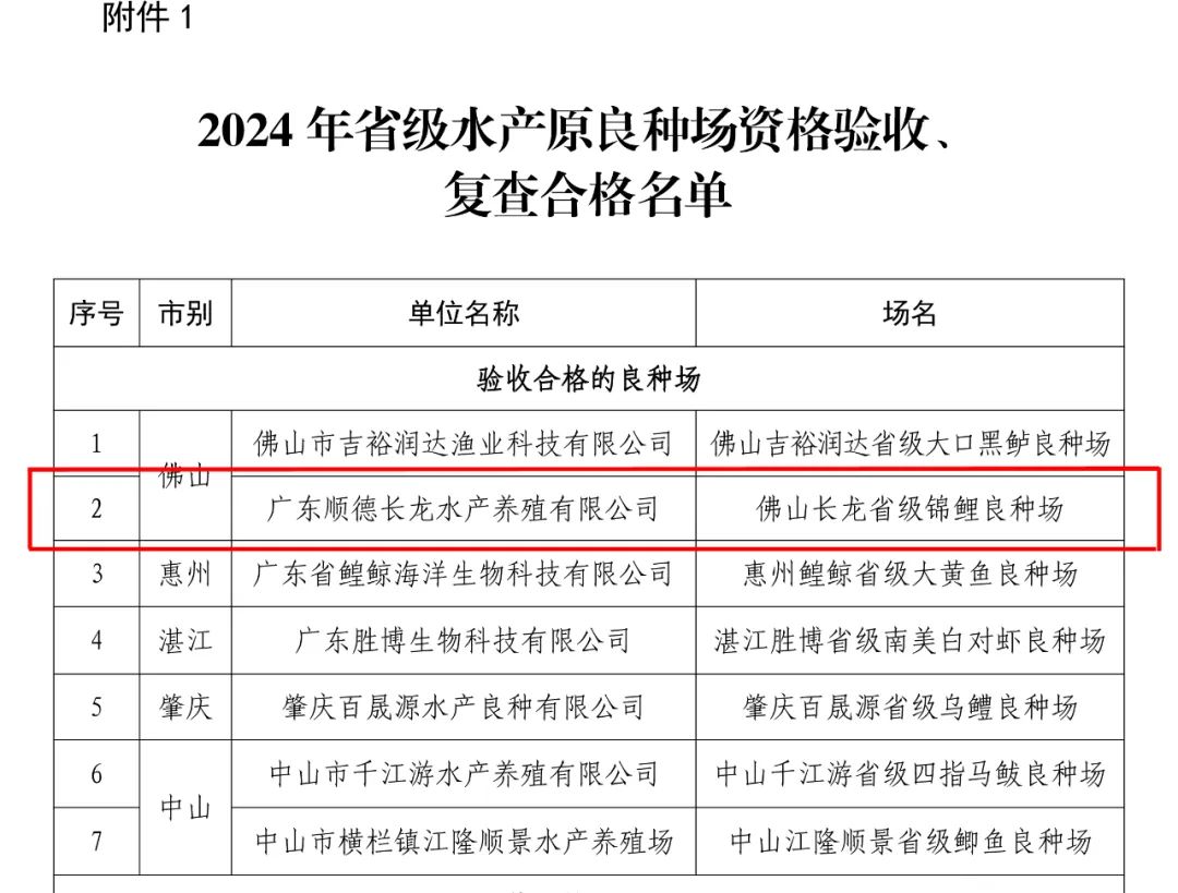 近日,广东省农业农村厅发布《关于2024年省级水产原良种场资格验收及复查结果的通知》。根据该通知,广东顺德长龙水产养殖有限公司(以下简称“长龙锦鲤”)申报的省级锦鲤良种场顺利通过了评审验收,正式成为广东省首家获得省级认定的锦鲤良种场,同时也是广东省首家观赏鱼省级良种场。