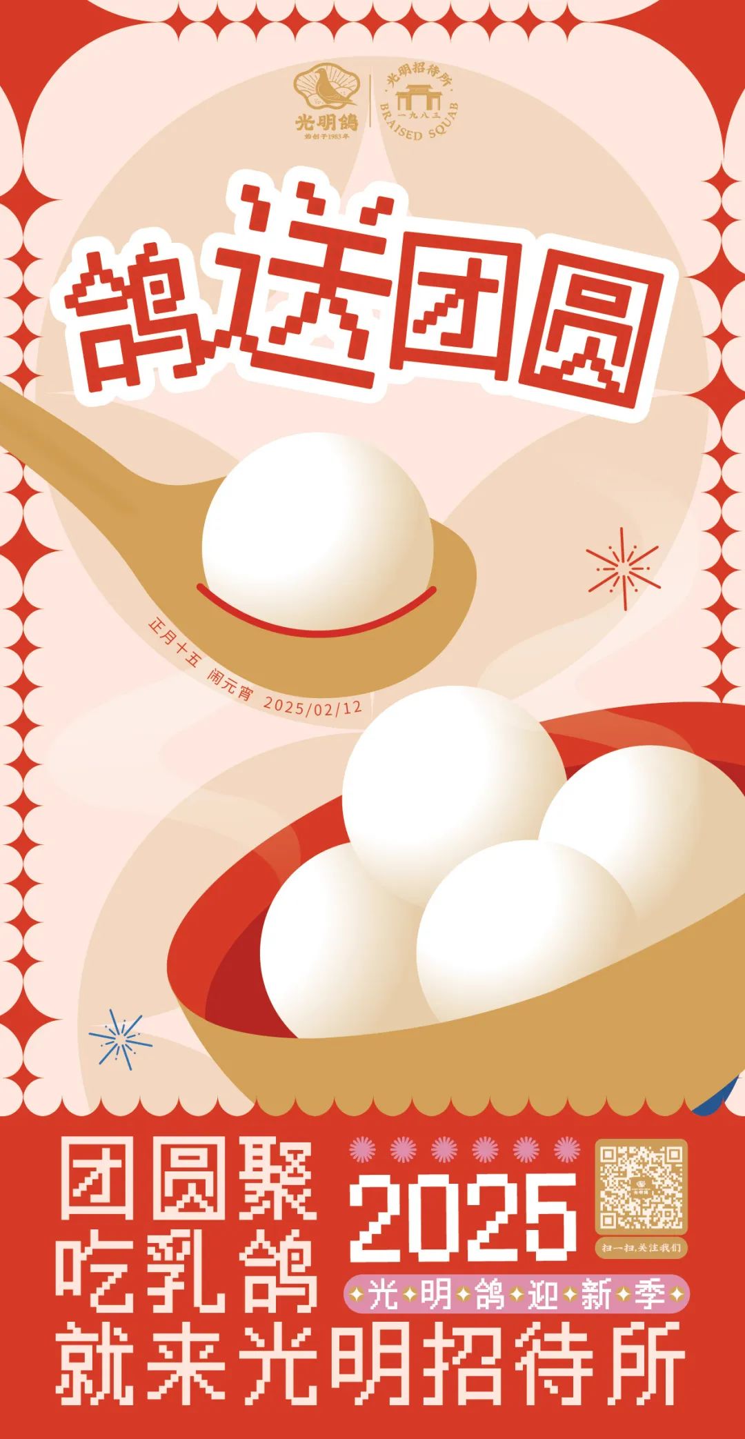 正月十五元宵至,光明招待所邀您共赴团圆之约!光明招待所三店(光明招待所老店、旗舰店、邦凯科技园店)联袂打造元宵工坊,您能亲手包元宵,揉面、搓圆、放馅料,感受传统魅力,不管亲子同来,还是好友相聚,亲手揉制的不只是软糯团子,更是代代相传的温情记忆。节日当天到店用餐,每桌赠予的玲珑元宵,咬开是流心的岁月甘甜。会员更是福利满满!2月10 - 12日前往机场卫星厅店,可免费领取元宵。此外,“风生水起捞鸽”等美食等您尝鲜,礼盒优惠、储值活动惊喜不断。元宵节“财神爷”还在,没和“财神爷”合影的朋友,快来门店与财神合影讨个好彩头!