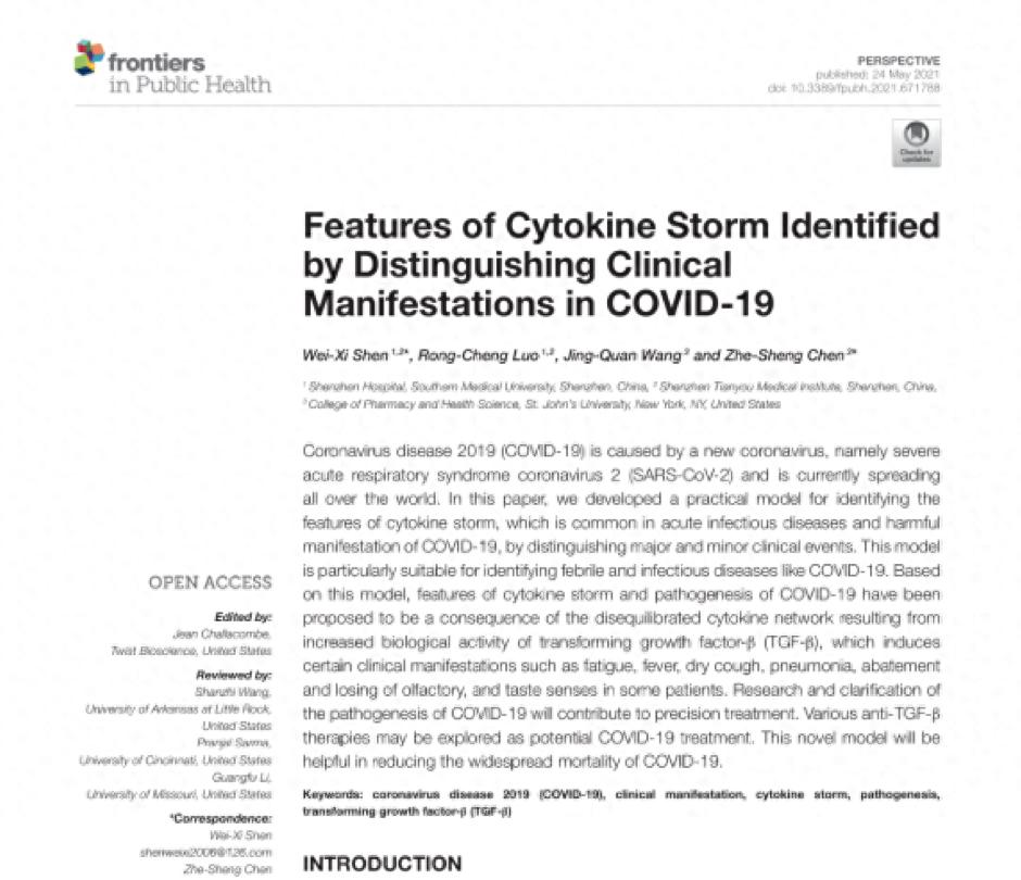 基于这一理论基础,近年来申维玺教授在进一步深入研究中发现,病毒性肺炎的细胞因子网络风暴特征是转化生长因子β(TGF-β)等细胞因子的活性异常升高,在细胞因子风暴中占优势地位、起着主导作用,从而出现了一系列的病理变化和临床表现。国际专业期刊Frontiers in Public Health对这一研究成果进行了刊发,论文也提出了及时采用中医药等治疗的有效性和重要性。根据细胞因子和临床表现之间存在的本质性的因果关系,申维玺教授等建立了一个新的医学诊断模型来识别急性感染性疾病引起的细胞因子风暴特征。通过观察患者的临床表现,区分临床表现的主次等,可以及时判断和识别出哪些细胞因子主导了疾病中的细胞因子网络失调(风暴)。