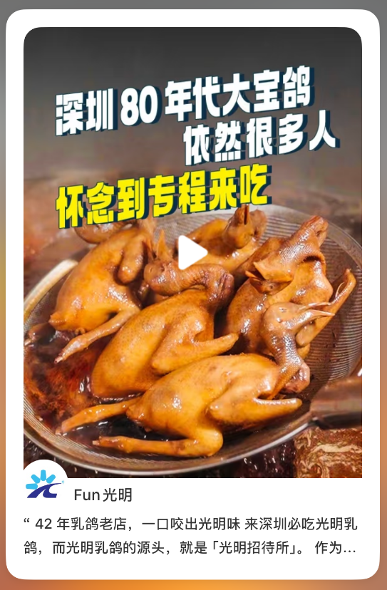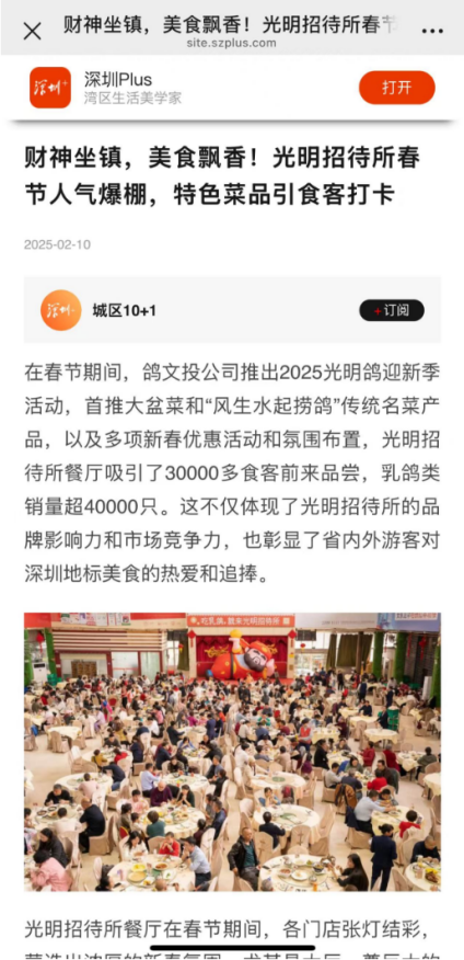 2025年,鸽文投公司通过进一步明确和强化“吃乳鸽,就来光明招待所”作为品牌输出的主宣语。通过线上+线下方式不断加强品牌宣传力度,将地标美食文化体验与公司经营紧密结合,传播“到深圳吃美食,就来光明吃乳鸽;到光明吃乳鸽,就来光明招待所”。线上与新媒体合作,在社交媒体、短视频平台及新闻媒体等多渠道进行广泛传播,同时积极与光明区媒体进行联合宣传并开展线上互动活动,截止2025年3月,已累计发布宣传推文等50多次;线下在光明区主要地段(光侨路、光明大道)、旅游景点、内部办公楼宇等多处投放广告,同时积极参与光明公司春节期间公交车品牌推广活动。通过区域活动联动,积极参与光明国际公路自行车赛、深圳光明国际网球公开赛、SIUF国际超模大赛光明集训季等系列活动,进一步强化“光明鸽”“光明招待所”品牌输出。