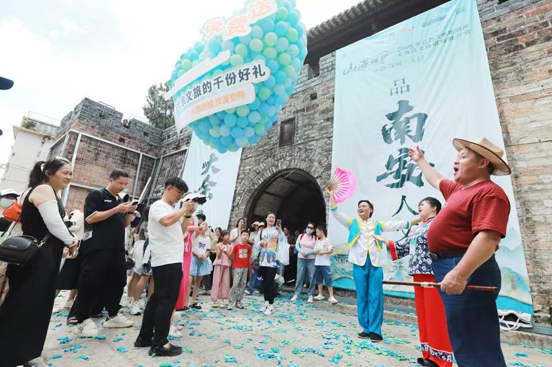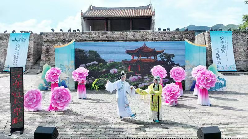 同时,大鹏所城同步开启“客韵迎宾 清凉雅集”派对,《牡丹亭》古装巡游再现“情不知所起,一往而深”的经典场景,丫山、梅关古驿道沉浸式推介与《魂牵梦绕牡丹亭》采茶折子戏相映成趣,客家集市汇聚南安板鸭、大余烫皮、牡丹亭多味花生等地标美食,“传统拓印”“古风投壶”等互动项目吸引游客深度感知大余独特的文化魅力。