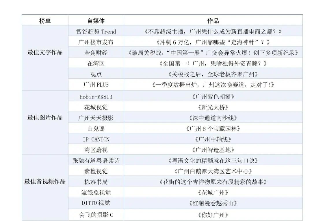 当天,现场公布了“读懂广州”2025年自媒体创作征集活动优秀作品榜单。经过专家评审和严格评选,最终评选出“最佳文字作品”“最佳图片作品”“最佳音视频作品”“最佳专题策划”和“网络正能量账号”五个榜单,24个作品和6个账号脱颖而出。这些作品和账号以独特视角和创新表达,生动呈现广州区域特色、文化传承、产业升级、国际传播等多维度建设成果,展示广州良好城市形象,让城市故事传播得更远、更广、更深入人心。