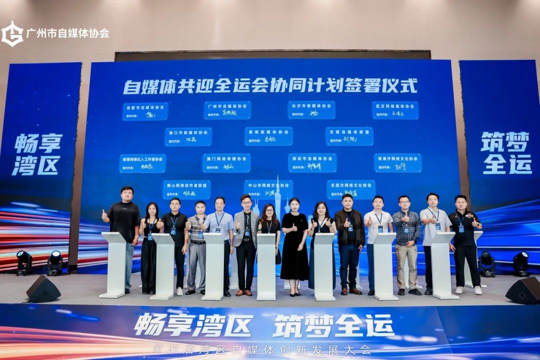 在探讨城市经济发展新动能的同时,大会着眼即将到来的第十五届全国运动会,着力构建跨区域自媒体传播矩阵。今年,第十五届全运会将首次由粤港澳三地联合举办,开幕式将在广州举办,备受瞩目。为助力这一体育盛会,现场来自广州市自媒体协会、深圳市自媒体协会、珠海市网络文化协会、佛山网络创作者联盟、东莞市网络文化协会、中山市网络文化协会、香港网络红人工作者协会、澳门网络传播协会等粤港澳大湾区城市,以及成都市自媒体协会、长沙市新媒体协会、武汉市网络媒体协会、昆明新媒体协会、海口市新媒体协会、无锡自媒体联盟等外省兄弟城市共14个城市的自媒体相关行业协会代表自发发起了《自媒体共迎全运会协同计划》,以行业力量赋能城市发展。