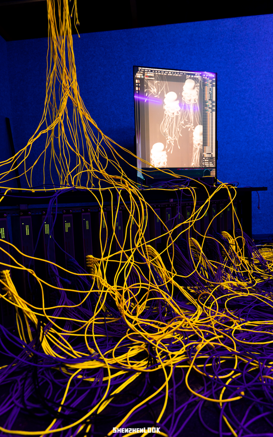 黄炜《矿野之息》(影像装置)以机械水母为载体,虚构AI水母因设备老化被 “安乐死” 的未来场景,借科技感形态提出 “自然有机体被算法取代时,人类与自然情感连接如何演变” 的命题,引发生态思辨。Philipp Artus《水生物》(交互动画)构建生成式水下生态,观众通过平板设计生物,其物种、行为选择构成动态画面,以简单算法呈现生命多样性的乌托邦想象,暗含人工生态替代自然的反乌托邦隐喻。