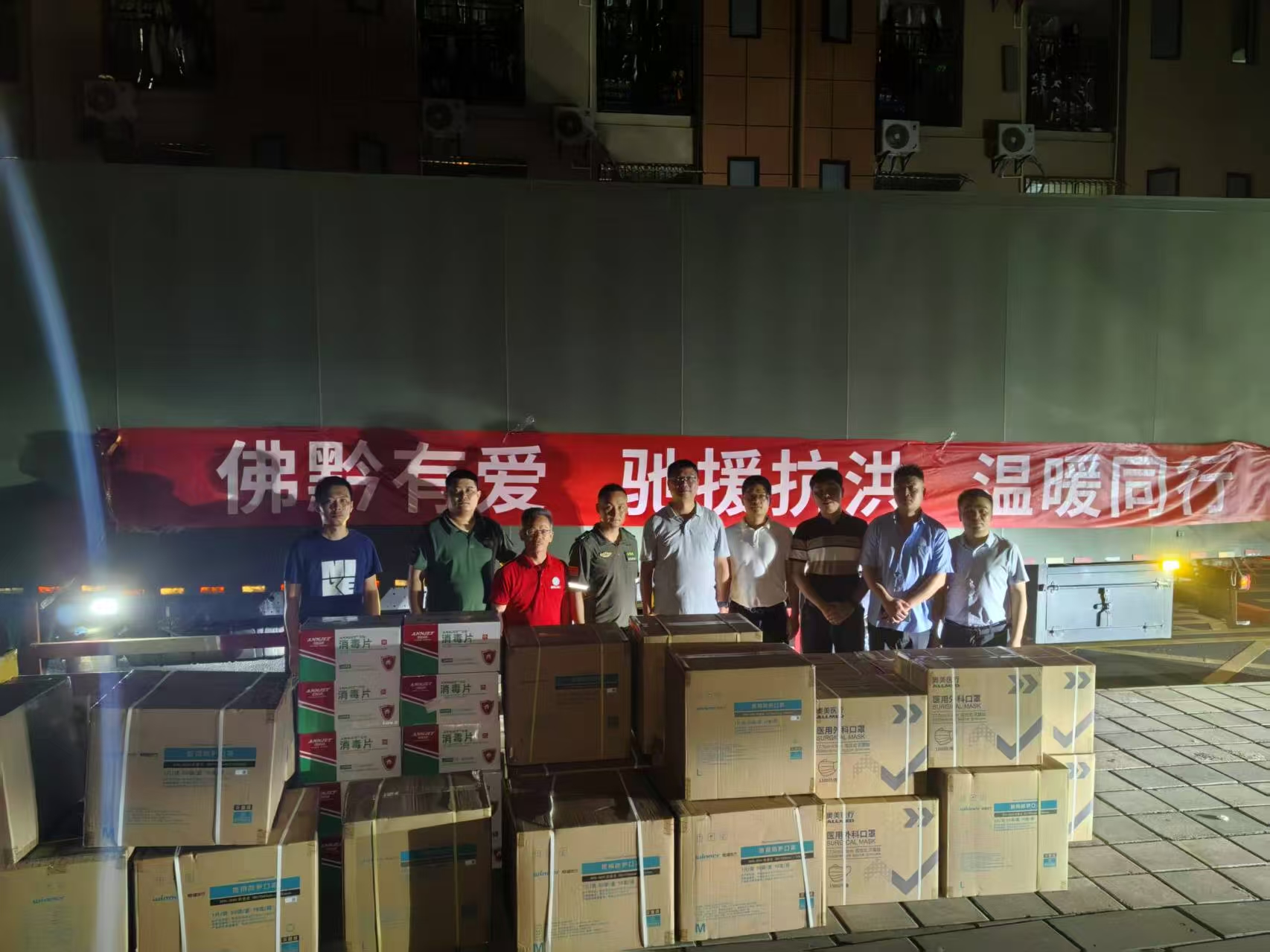 灾后防疫同样刻不容缓。 6月27日,佛山市委市政府紧急组织的价值12.2万元防疫物资(含外科口罩、N95口罩、消毒片)从佛山发出,当晚即送达从江、榕江两县,共筑牢灾区卫生防线。