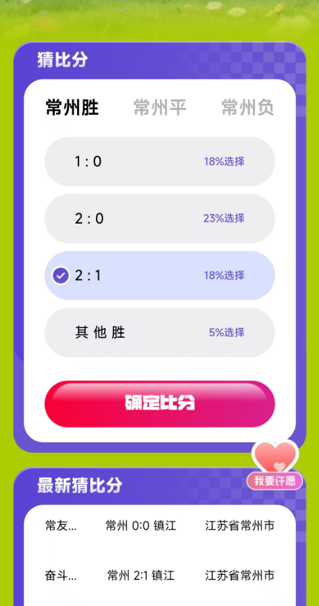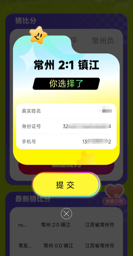 活动超简单:下载登录常观APP,进入许愿池猜比分活动页面,预测常州队VS镇江队的全场最终比分,选择相应的比分结果,并且登记好个人基本信息(姓名、联系方式、身份证号码)提交,即可完成竞猜。