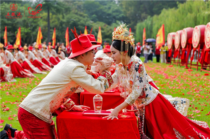 而本届婚典最令人瞩目的是首次在西湖上空放飞千架无人机贺喜。当晚8点,千架无人机汇聚在西湖上空,黑丝绒般的夜空中出现了一朵巨型的“红玫瑰”,全场观众都情不自禁地发出了惊叹声!随后,天空中又陆续地出现了“中意爱情之都 共谱爱情诗篇”“爱在杭州 情到永远”等美好祝福语,坐在观众席中来自意大利·那不勒斯的一对新人激动不已地感叹道:“我太喜欢中国文化了,今天是我第一次穿中国的婚礼服,和爱人在西湖水上拜天地、赏大型水上实景表演、观无人机表演,让我感受到中国婚礼是如此的隆重,我的家人也来到了现场观礼,太感谢五粮液玫瑰婚典了。”