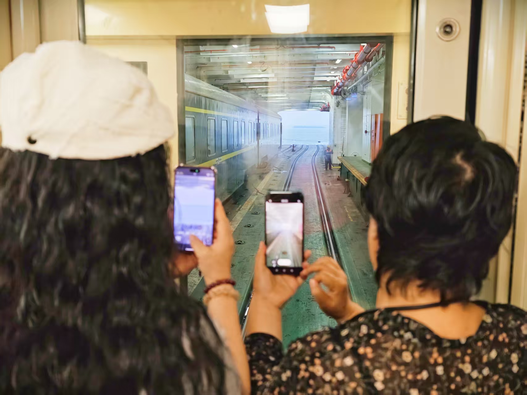 该首发团是10月26日晚从深圳东站出发,团友登上绿皮火车卧铺车厢,开始领略睡一觉就抵海南海口旅途经历,次日早晨火车已在海上在轮渡上了,团友可透过窗口见到大海,纷纷举起手机通过车厢拍火车与大海相辉映的画面,定格难得一见的景色。