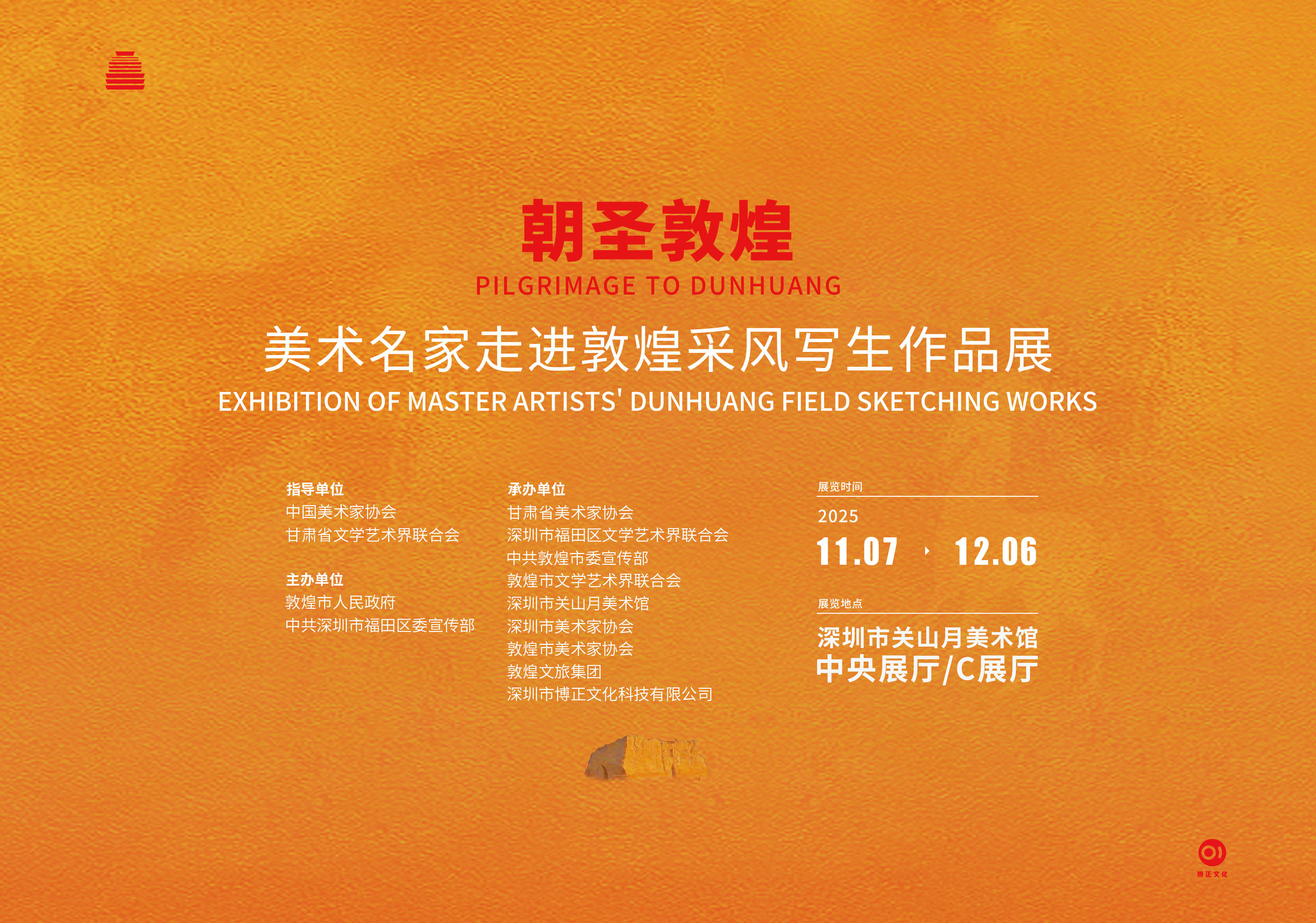 本次展览在中国美术家协会、甘肃省文学艺术界联合会的指导下,由敦煌市人民政府、中共深圳市福田区委宣传部主办,甘肃省美术家协会、中共敦煌市委宣传部、深圳市福田区文学艺术界联合会、敦煌市文学艺术界联合会、深圳市关山月美术馆、深圳市美术家协会、敦煌市美术家协会、敦煌文旅集团、深圳市博正文化科技有限公司联合承办。
