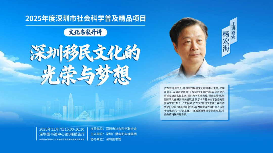 11月7日(本周五)下午,2025年度深圳市社会科学普及精品项目——文化名家开讲邀请知名文化学者——深圳市特区文化研究中心原主任、深圳市文联原专职副主席、深圳大学客座教授杨宏海,带领市民一同深入深圳的文化肌理,解读这座奇迹之城的人文密码。他将从深圳移民文化的历史回望开始,为我们展现移民大潮铸就的“深派文化”,以及面对大湾区未来的历史使命,为我们呈现一场兼具思想高度与现实洞察的深度分享。