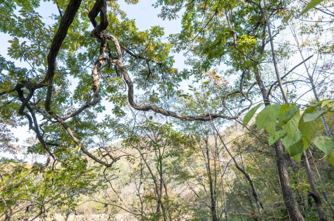 这株南蛇藤已有1000年了。“它原本盘踞在石头上,石头滑落后,便寻到了这棵橿子栎。”吴慧博说。古藤先与石结盟,后与木相守,成就了一段共生共荣的深山奇观。