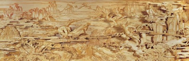 陆大师有如此底气,是他已经创造了“多层叠雕”技法,并应用在一年前山东刘公岛海圣殿大型壁挂《李龙的传说》中。确实,只要是木材都会开裂变形,为了解决开裂变形对作品的影响问题,陆大师从木材着手,在1992年牵头召开了国际会议,研究其稳定性处理方法;同时进行雕刻技艺研究,经过数年努力,终于诞生了“多层叠雕”新技法。新技法的运用,彻底解决了东阳木雕不能制作大作品的困惑。