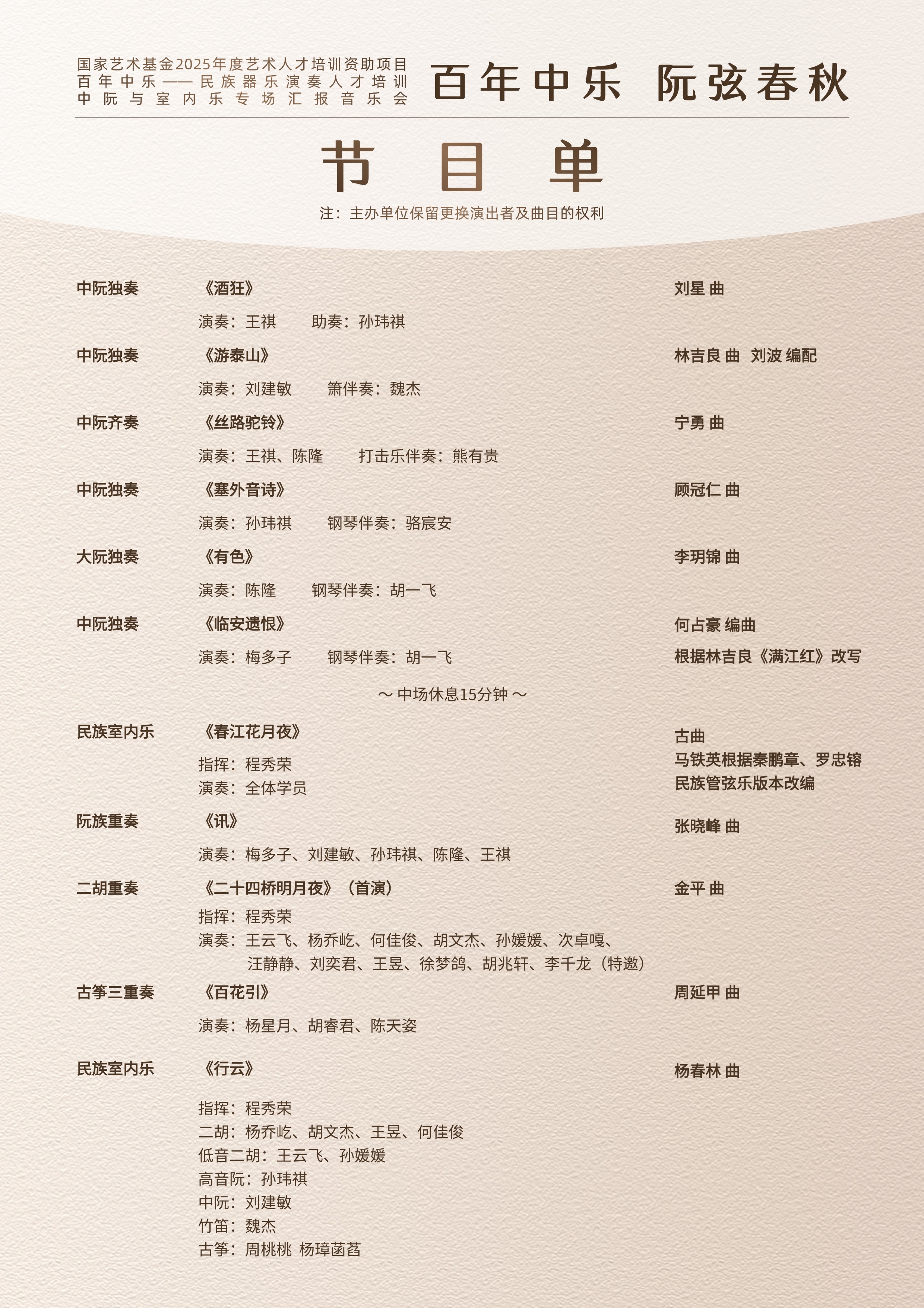 音乐会由著名作曲家叶小钢担任荣誉艺术总指导,程秀荣、马铁英等多位资深艺术家担任导师。演出形式丰富,涵盖中阮独奏、齐奏、阮族重奏、二胡重奏、古筝三重奏及民族室内乐等,演绎了《酒狂》《游泰山》《塞外音诗》《临安遗恨》《有色》《讯》等多部经典与现代作品,展现民族音乐守正创新的艺术活力。