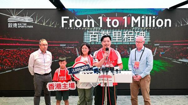 香港启德体育园主场馆31日迎来第100万名观众。园方为幸运观众叶先生一家举行了庆祝仪式。
