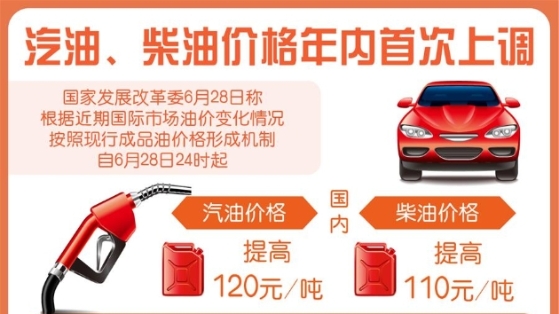 在连续三个月因国内成品油价格挂靠的国际市场原油平均价格低于每桶40美元调控下限未作调整后,国内汽油、柴油价格将实现2020年首次上调。国家发展改革委28日称,根据近期国际市场油价变化情况,按照现行成品油价格形成机制,自6月28日24时起,国内汽油、柴油价格每吨分别提高120元和110元。