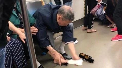 地铁上,老爷爷和老奶奶互换鞋袜,这大概就是爱情最美好的样子