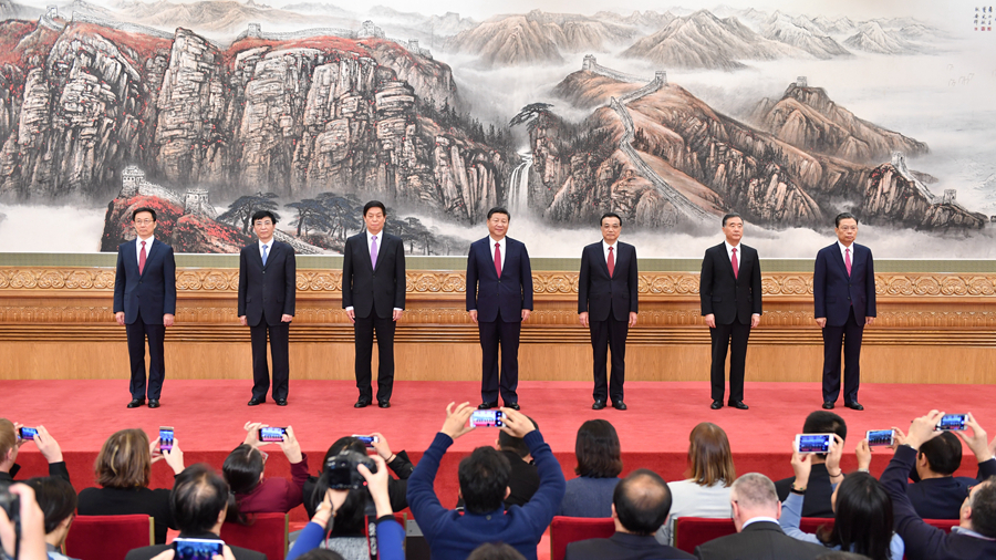 10月25日,党的十九届中央委员会第一次全体会议新选出的中央政治局常委同中外记者见面。