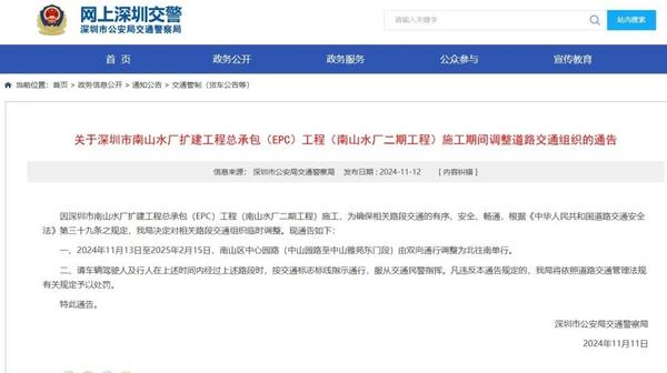 11月14日,深圳交警发布最新通告:深圳这些路段因施工将临时封闭、调整等,大家注意绕行。