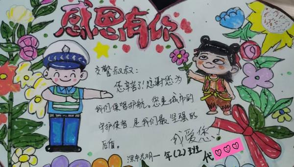近日,光明大队玉塘中队铁骑队员陈武彪执勤时,迎来了一位特殊的“来访者”——六七岁的小男孩手捧着爱心画卡,红扑扑的脸蛋上满是认真,将这幅画有微笑交警、写满感谢话语的作品郑重递出。
