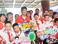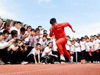 “飞人”归来“传经”忙苏炳添荣归故里,首站到母校与师弟师妹互动,并共同摆出“9.83”图案