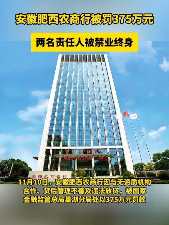 因违法发放贷款等原因,安徽肥西农商行被罚375万元,两名责任人被禁业终身!#肥西农村商业银行 #银行 #金融监管
