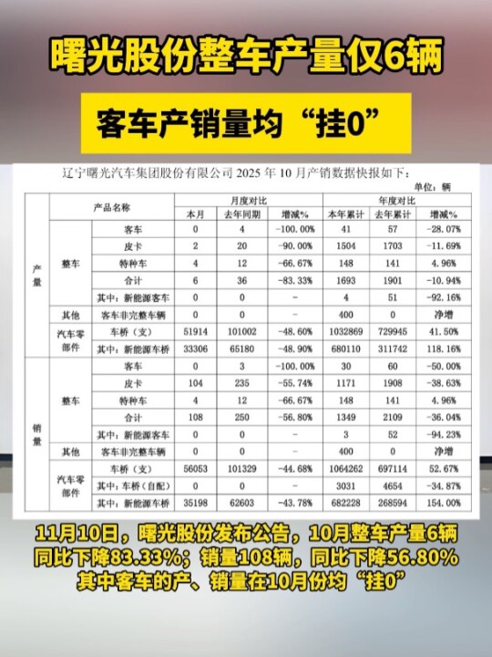 整车产量仅6辆,客车产销量均“挂0”!曙光股份10月产销量大幅下滑。#曙光股份