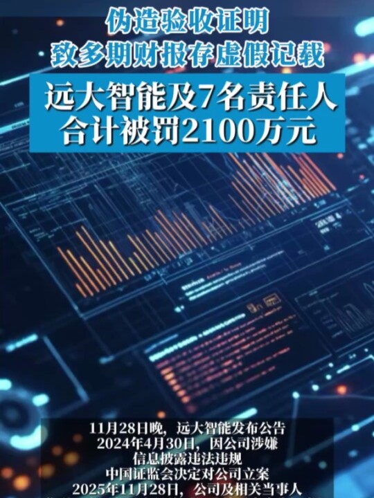 伪造验收证明致多期财报存虚假记载!远大智能及7名责任人合计被罚2100万元。 #远大智能 #科技 #罚款