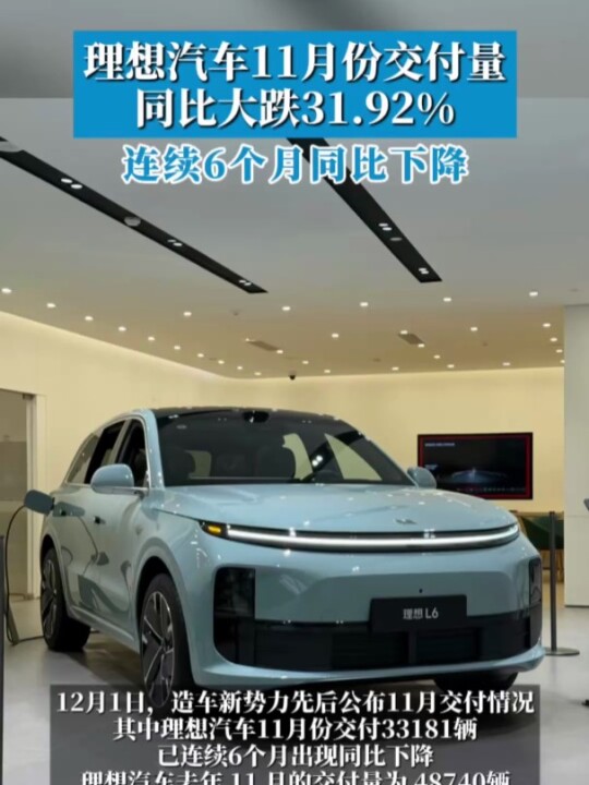 理想汽车11月份交付量同比大跌31.92%!连续6个月同比下降。 #理想汽车 #新能源 #汽车 #交付