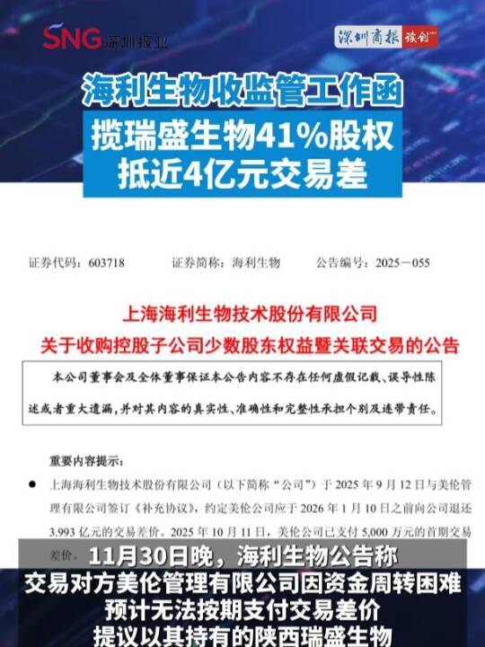 欠款变股权!海利生物收监管工作函,揽瑞盛生物41%股权抵近4亿元交易差 #海利生物